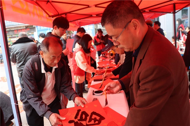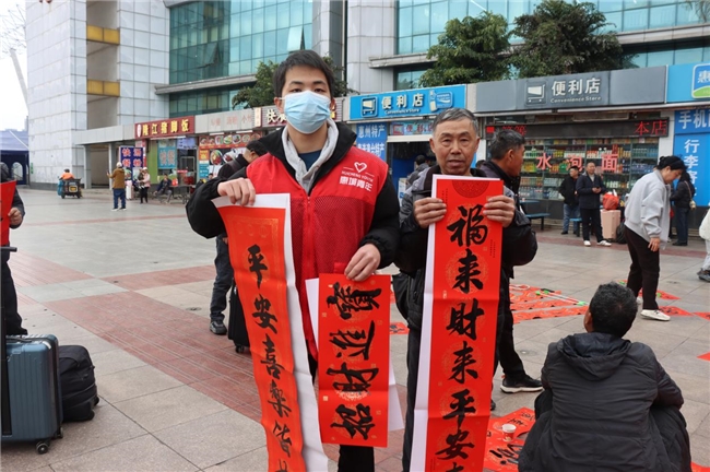 活动现场,来自广铁惠州书法协会的书法爱好者与铁路退休老党员们挥毫泼墨,红纸铺展间,一副副寓意出入平安、阖家幸福的春联跃然纸上,一个个饱含美好期许的“福”字墨香四溢。旅客们或驻足等候,或亲手接过这份手写的新春祝福,脸上满是笑意,春运旅途的疲惫被浓浓的年味与温情驱散。