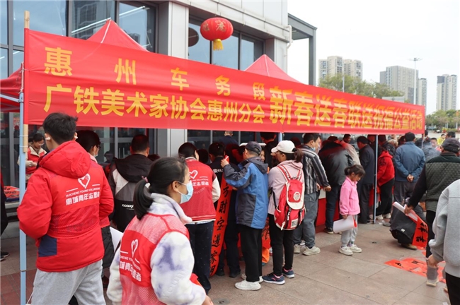 2026年2月8日上午9点30分,春运高峰时节的惠州火车站暖意融融,广东公司关工委惠州工作站携手小金口街道金青社区党委、广铁惠州书法协会、铁路退休党委,共同开展“大手牵小手,学雷锋”志愿服务活动,以笔墨传情送新春祝福,以贴心帮扶护旅客平安,让往来游子把惠州的文化温情与暖心情谊带回家。